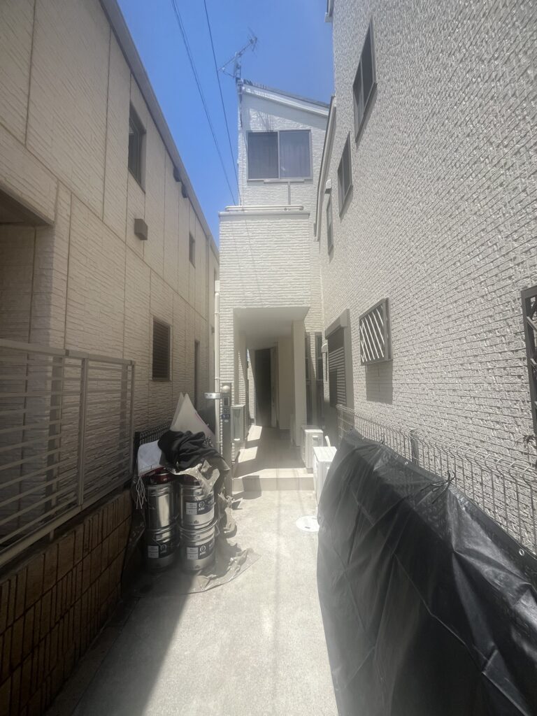 3階建ての現場では一面隣の家との距離がすごい近くて足場がある状態では狭い所でしたが、5人での作業だったので無理をせずに落ち着いて作業を行った為、何事もなく完了致しました!